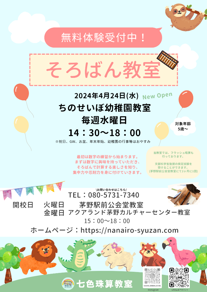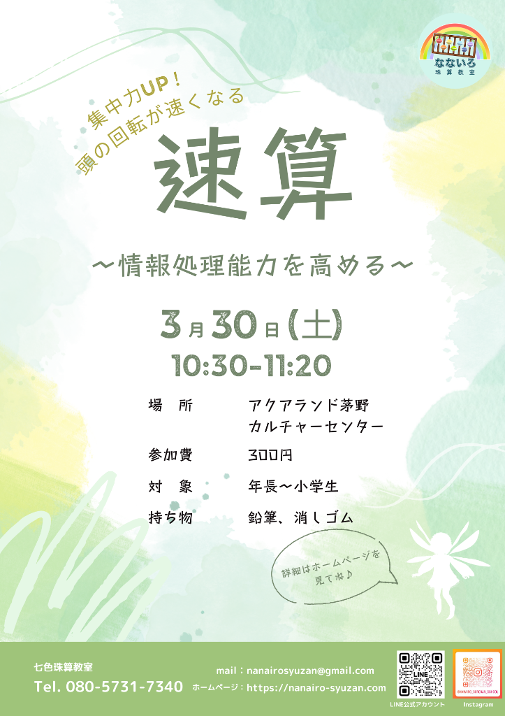 お申し込みは茅野市の七色珠算教室までお電話もしくはメッセージをくださいませ。